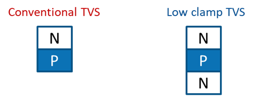 Super Clamp TVS adopts BJT (Bipolar junction transistor) which is different from conventional TVS as shown in Figure 1. When breakdown voltage occurs for Super Clamp TVS, due to its instinctive snapback characteristics, it foldbacks and then breakdown happens again. This low clamp ratio provides lower VC (clamping voltage) at high IPP (peak impulse current), which means the discrete components, which come after the Super Clamp TVS, could sustain lower voltage stress and designer could use lower working voltage specification components like capacitor, MOSFET etc.