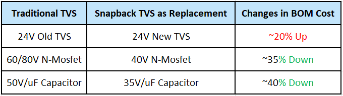Super Clamp TVS adopts snapback technology and its low VC could help protect discrete components sustain lower voltage stress, based on application design, compared to conventional TVS. That helps downsizing components rating and eventually BOM cost reduction.