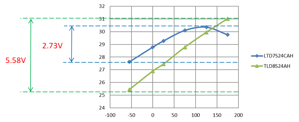 VBR will be a focus point for a designer if TVS inadequately turns on when temperature is increasing. Taking Super Clamp TVS LTD7S24CAH and conventional TVS TLD8S24AH to test VBR in temperature range -55⁰C to 175⁰C as shown in Figure 8. For LTD7S24CA, when operating in temperature range -55⁰C to 175⁰C, VBR deviation difference is 2.73V; For TLD8S24A, when operating in temperature range -55⁰C to 175⁰C, VBR deviation difference is 5.58V. So, for LTD7S24CA VBR difference of temperature deviation is more stable than TLD8S24A.