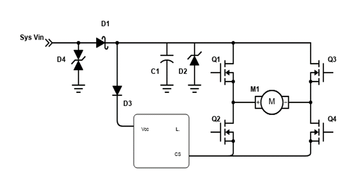 24V industry Fan uses Single phase H-bridge BLDC motor circuit as shown in Figure 6. The motor exhibits Back-EMF (Back Electromotive Force) when in operation. When current flows through motor, Back-EMF will flow to voltage source while motor decelerates or stops and it might damage front components like MOSFET.