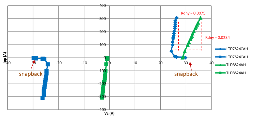 Taking Super Clamp TVS LTD7S24CAH and conventional TVS TLD8S24AH to test 10/1000us transient surge and recording VC – IPP waveform as shown in Figure 4. LTD7S24CAH curve shows snapback characteristics whose VC clamping ratio is 1.049 (VC/VWM) and Rdny is 0.0075 ohm, which are lower than those of TLD8S24AH. TLD8S24AH curve shows exponential characteristics whose VC clamping ratio is 1.349 (VC/VWM) and Rdny is 0.0234 ohm. Super Clamp TVS can suppress transient surge closer to VBR than conventional TVS.