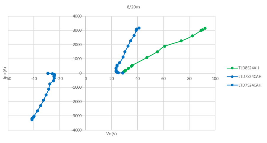 Super Clamp TVS LTD7S24CAH and conventional TVS TLD8S24AH tested 8/20u IPP=155A