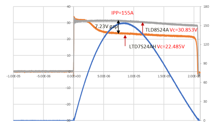 Taking Super Clamp TVS LTD7S24CAH and conventional TVS TLD8S24AH to test 8/20us transient surge. Applying 8/20us of IPP=155A to these two TVS and recording VC results as in Figure 3. LTD7S24CAH VC (23.623V) is 76.56% of TLD8S24A VC (30.853V).
