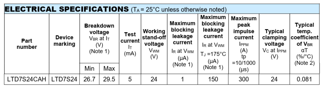 In order to understand Super Clamp TVS characteristics and advantages over conventional TVS, take DO-218AB package bi-directional Super Clamp TVS LTD7S24CAH of TaiwanSemi and DO-218AB package uni-directional conventional TVS TLD8S24AH of TaiwanSemi to do the comparison.