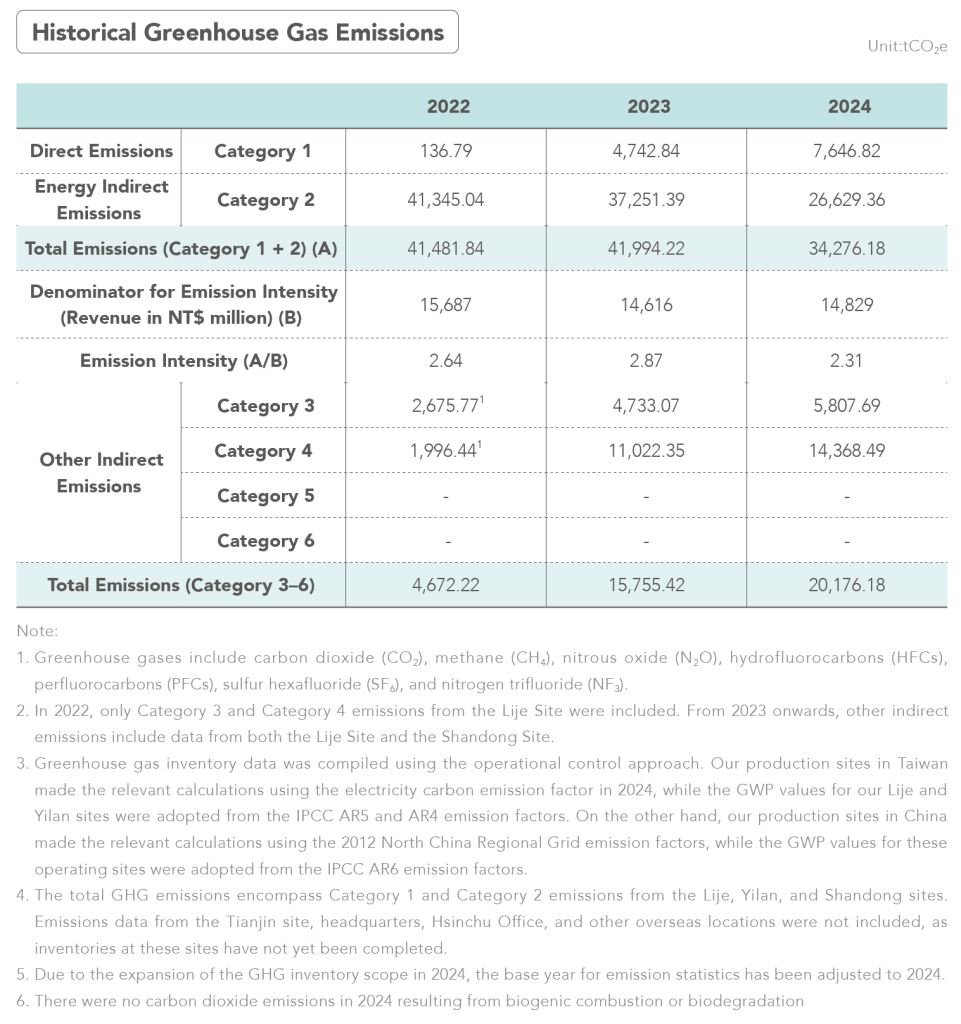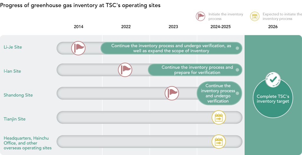 Companies. We are expected to complete our overall greenhouse gas inventory, which will cover our production sites across Taiwan and China, as well as other overseas operating sites, by 2026. In addition, we continue to expand the scope of inventory categories to identify major carbon emission hotspots within the organization, thereby enabling the formulation of more precise GHG reduction targets. In 2024, TSC’s Scope 1 and Scope 2 greenhouse gas emissions declined, primarily due to greater adoption of renewable energy, which accounted for 23% of the company’s total energy consumption.