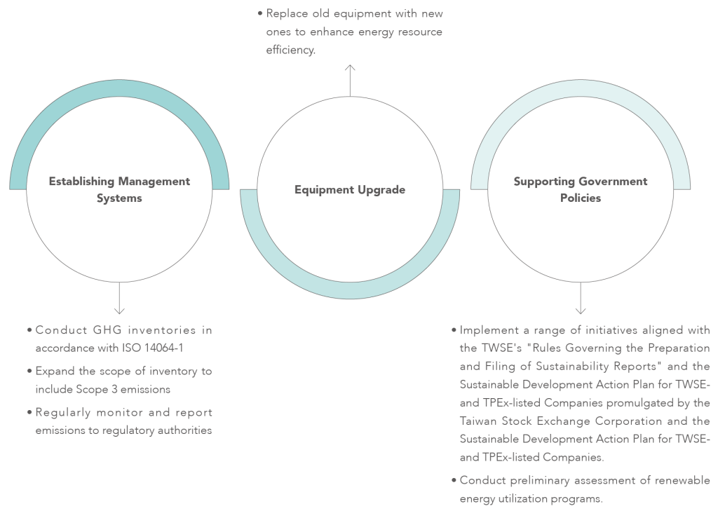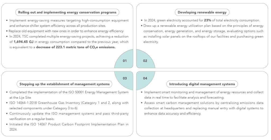 According to its Carbon Management Roadmap, TSC’s short-term objective is to establish a solid organizational foundation. This includes completing a comprehensive GHG inventory and initiating product carbon footprint calculations based on the ISO 14067 framework. At the same time, guided by its short-, medium-, and long-term carbon reduction strategies, TSC has strengthened energy-saving efforts across its facilities and begun utilizing renewable electricity. Key initiatives include: rolling out and implementing energy conservation programs, developing renewable energy, stepping up the establishment of management systems, and introducing digital management systems. With a number of energy conservation and carbon reduction measures in place, we endeavor to not only gradually replace old equipment at our production sites with high-efficiency treatment equipment and optimize energy efficiency on an ongoing basis, but also roll out and engage in energy transition by installing renewable energy equipment such as solar power generation facilities across all operating sites, thereby progressively advancing its energy transition efforts.