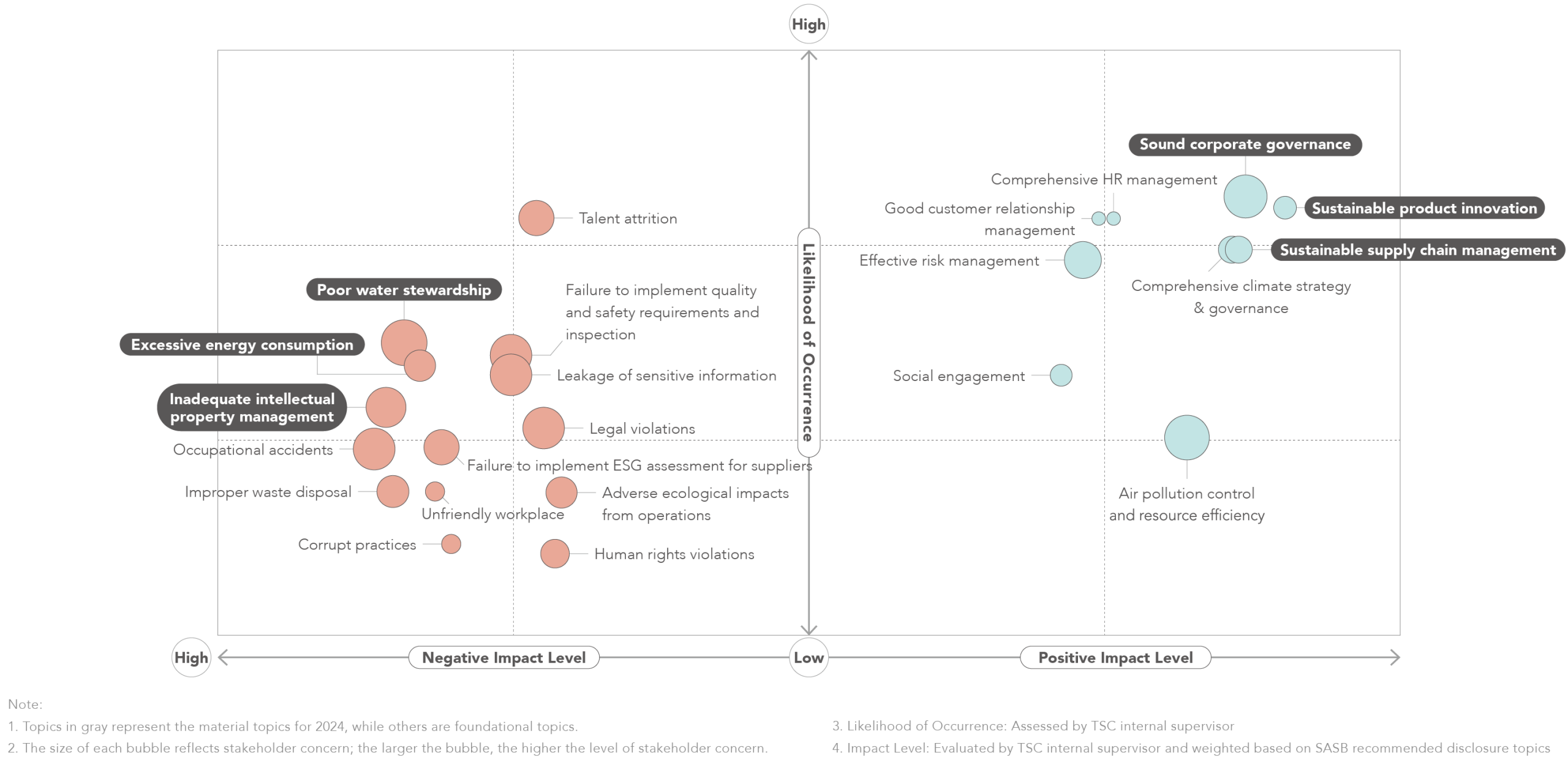 In 2024, TSC collected 44 valid internal and external stakeholder questionnaires to better understand stakeholder concerns. TSC will continue refining its materiality assessments and communication mechanisms. In 2024, six material topics were identified: