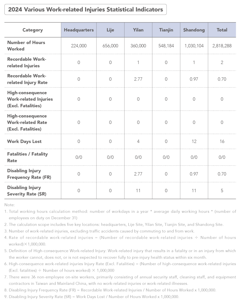 Regular risk assessments address hazards such as organic solvents, acid-base chemicals, highpressure gas, and crane operations. Each site monitors legislative updates, implements control mechanisms, and conducts pre-operation checks, on-site inspections, and spot checks to correct unsafe behaviors and enhance safety facilities.