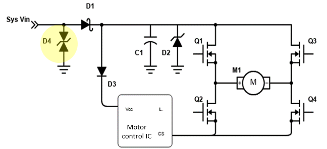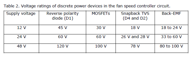Fig. 5 illustrates how snapback TVS devices offer advantages over conventional TVS approaches when protecting a single-bridge BLDC (brushless direct current) fan speed controller. In this application example, the low VC of the snapback TVS device helps protect the motor controller and other components with lower voltage stress. Compared with using a conventional TVS or other alternatives, it also has greater power density and results in less overdesign. Table 2 lists the ratings of devices that would be applied at different supply voltages and assumes use of a snapback TVS for both D4 and D2.