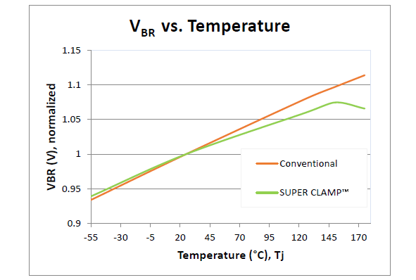 Because it has a “not to exceed” limit capability, the snapback TVS device obviates the need to overdesign. It allows designers to use lower working voltage components, such as capacitors, switching MOSFETs, reverse polarity protection diodes, and regulators. Additionally, its breakdown voltage (VBR) varies much less over temperature than conventional TVS devices (Fig. 4). This VBR stability vs. temperature helps the designer anticipate voltage range over temperature considerations (i.e., what could happen when…)