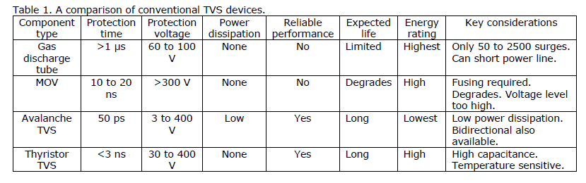 This article begins with some comments on the technology and market trends that are driving adoption of TVSs. It then provides an overview of conventional TVS devices, discussing their pros and cons, starting with historical solutions like SCRs, and then moving onto the currently used gas discharge tubes, metal oxide varistors, and TVSs.