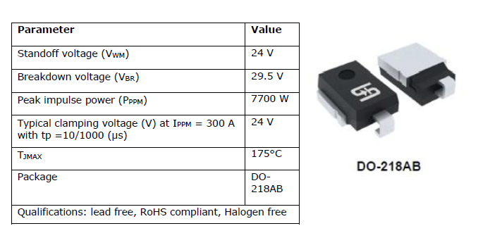 Fig. 1 shows the key parameters of a Taiwan Semiconductor SUPER CLAMP device. This 7700-W, 24-V surface-mount snapback TVS device (model LTD7S24CAH)[5] offers better accuracy and precision than previous semiconductor TVS protection devices. It can pass AEC-Q automotive reliability standards even when used in extremely demanding applications. Snapback TVS technology provides powerful protection in a small form factor, making it suitable for integration into space-constrained designs.