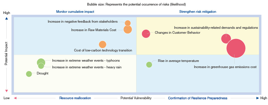 Based on the impact of climate risks on the operation and value chain of TSC’s business, and the materiality of those risks, the ESG Office assesses related solutions and business opportunities so as to formulate operational strategy adjustment directions and response measures and report to the President, who is responsible for risk management.