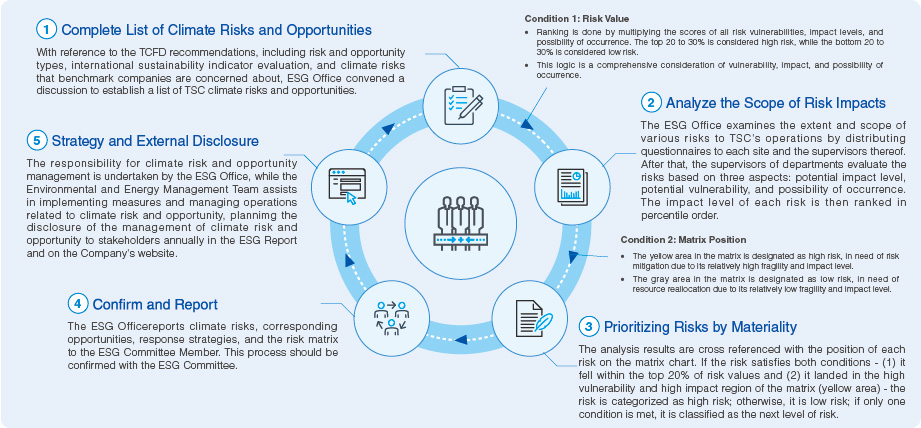 To improve the climate-related risks and opportunities management mechanism, TSC follows the guidelines of the TCFD and has established a climate-related risk management procedure. This procedure consists of the following steps: (1) establishing a climate risk list, (2) analyzing the scope and duration of risk impacts, (3) prioritizing risks by materiality, (4) confirming and reporting, and (5) implementing strategies and disclosing to the public.