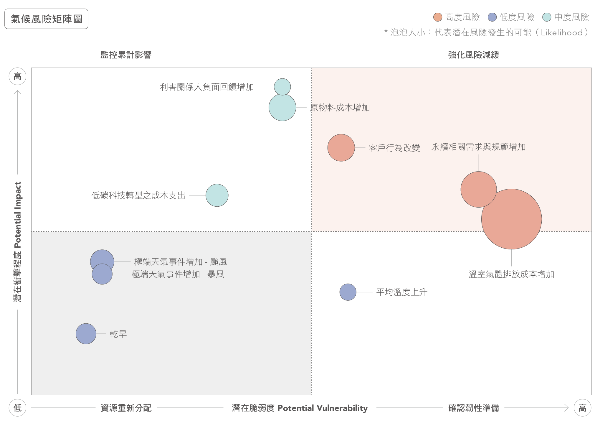 台半密切關注氣候變遷可能帶來的風險與商業機會,依循臺灣證券交易所「上市公司編製與申報永續報告書作業辦法」並參考TCFD(Task Force on Climate-related Financial Disclosures) 氣候相關財務揭露建議,透明揭露氣候相關風險及機會之管理與因應措施。台半的氣候風險與機會管理機制與公司風險管理流程相互整合,透過「治理、策略、風險管理、指標與目標」四大方向,持續推動低碳轉型,並強化公司因應氣候變遷的韌性。