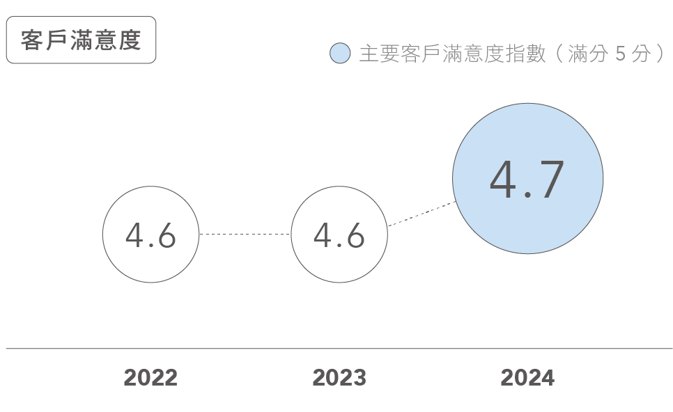 台半透過年度滿意度調查和客戶評分卡(Scorecard)雙重機制,全方位掌握客戶滿意度。每年針對前一年營業額佔比>70% 以上之主要客戶,以線上問卷進行年度滿意度調查。調查內容涵蓋「客戶服務與業務支援」、「交期」、「品質」以及「客戶體驗與夥伴關係」等四大面向。近三年客戶滿意度皆達到4.5 分以上(滿分為5 分)。對於已提供客戶評分卡之客戶,則以評分卡數據分析是否符合客戶標準,不另行發送滿意度調查問卷。2024 年所有客戶評分卡顯示台半在各項指標上皆達到客戶標準。未來台半將以持續客戶滿意為核心,致力於精進服務。