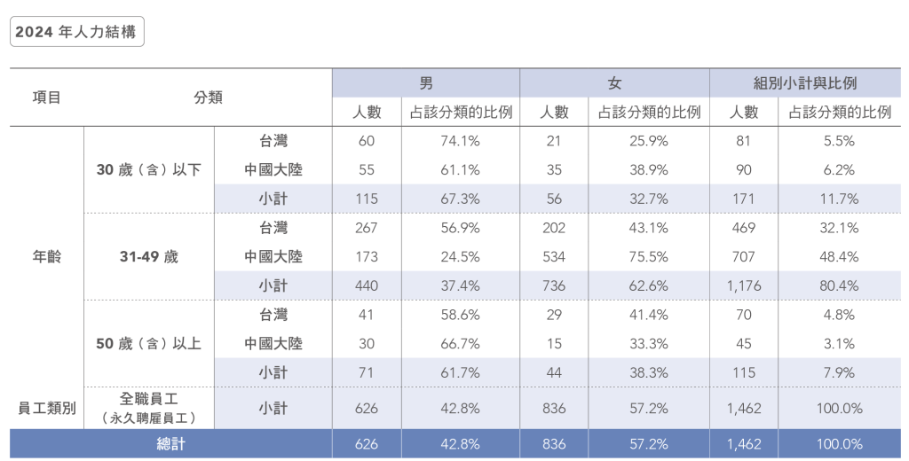 此外,為提升招募甄選的專業性與公平性,台灣地區將職能亦融入選才評估,整體從發展潛力到契合度等面向進行綜合評估,確保找到最適任的人才,同時促進組織的長遠發展。經職能選才實施後,台半整體員工留任率進一步從84.8%(2023 年)提升至86.6%(2024 年),可見其對組織人才穩定發展的影響。2024 年度,各地區因應公司長期計畫發展與組織調整,包含增設各式專業部門以及對既有部門進行更詳細的職掌分工,以提升運作效率與長期競爭力。合計2024 年台灣地區及中國各據點總員工人數為1,462 人,皆為全職員工。