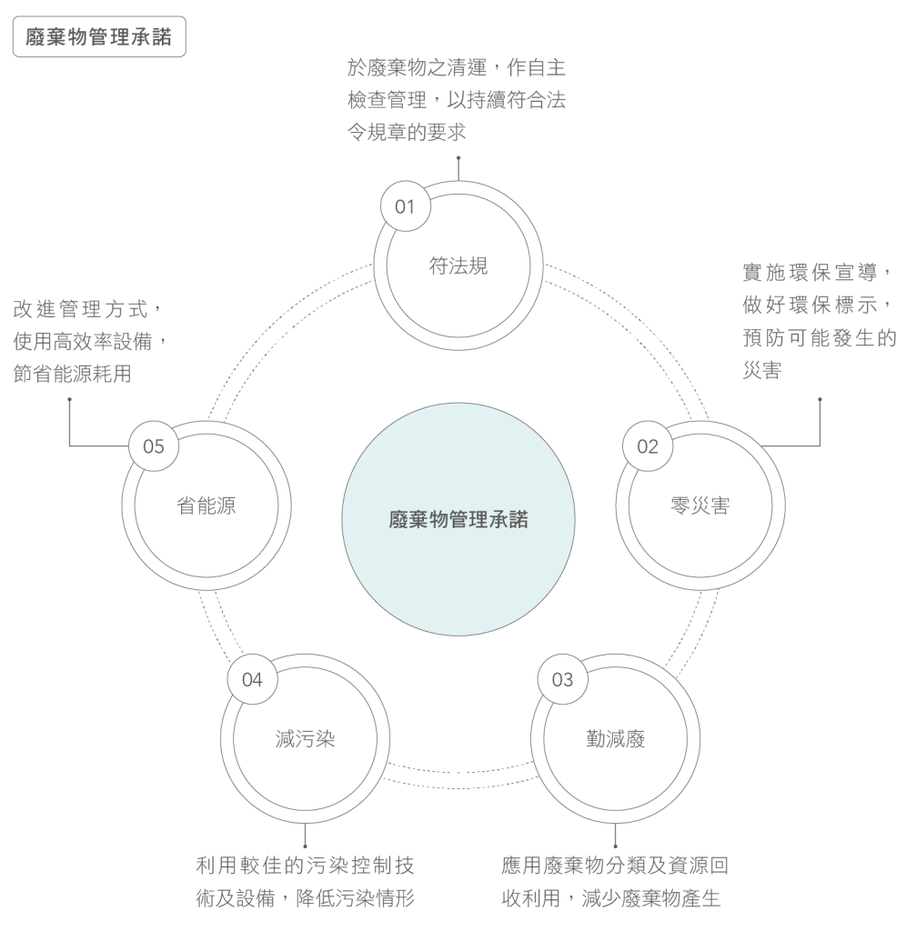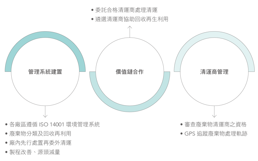 針對製程性質之差異,各廠所產生的廢棄物種類也部分相異。台灣廠區與山東廠除訂有「廢棄物清運流程」,強化廢棄物清運之管理,隨時追蹤當地法規變化,不定期檢視執行現況、召開會議,進行滾動式檢討修正,以落實廢棄物管理作為。天津廠則配合當地政府政策,與公部門簽訂清運合約統一清運。