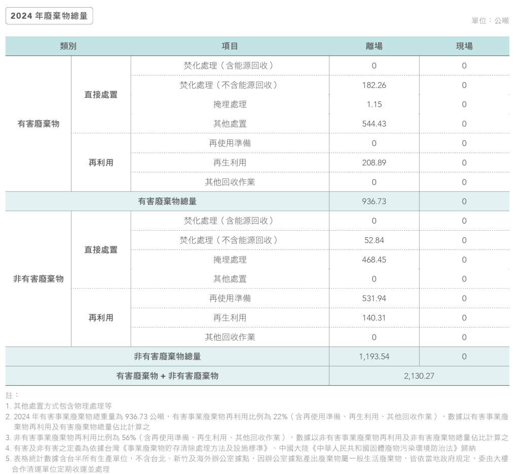 台半2024年度總共產出 2,130.27 公噸廢棄物,其中有害事業廢棄物 936.73 公噸(佔比44%),非有害事業廢棄物 1,193.54 公噸(佔比56%),各廠皆委託合格廢棄物清運商協助清運處理。各廠廢棄物統計由廠務單位定期執行內部統計,並依當地政府規範定期申報、留存清運過磅三聯單等佐證資料以利備查。
